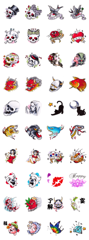 クールでオシャレなタトゥーデザインのスタンプですアメリカントラディショナル風を中心にジャパニーズ風など色々詰め込みましたHISSAN より発売
