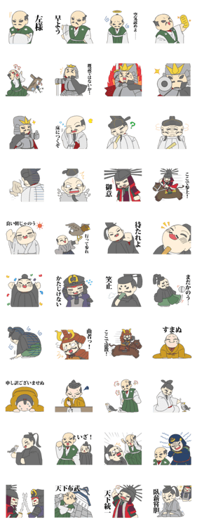 戦国時代を舞台にした稲刈り系アプリゲーム「戦国村を作ろう!」に登場する武将の織田信長、豊臣秀吉、徳川家康、今川義元、明智光秀のかわいいスタンプです!株式会社リクスタ より発売