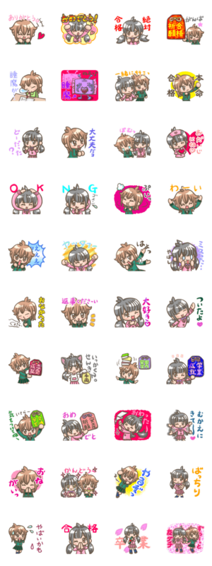 合格祈願や、卒業・合格を祝うスタンプです。受験生や、学生を応援するご家族・友人にも使いやすくなっています。お守りもたくさんあるよ!離れてもずーっと一緒だよ。