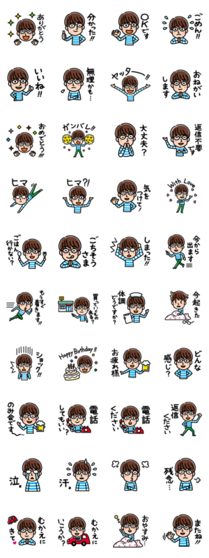 メガネの男性が日常で使える、ちょっとかわいい挨拶スタンプです。あこなち より発売