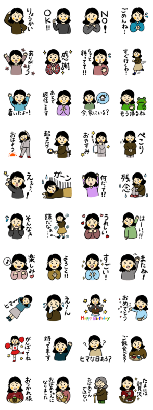 60代の母向けに作成しました。「シワは描かずに、美化した感じで」との要望のため、ちょっと若めなキャラ設定です。母のよく使う文言をスタンプ化しています。