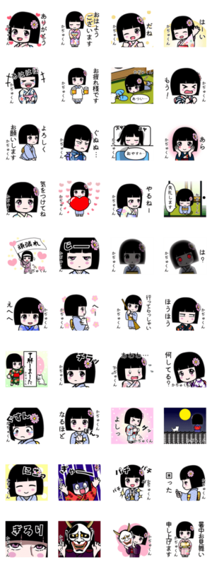 『かぢゅくん』用のよく使う言葉を詰め合わせた座敷童子のスタンプです。和服 着物 浴衣かがりひな より発売