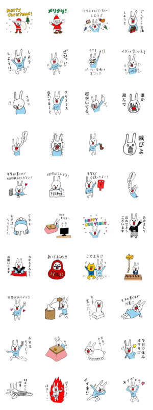 「ウサギのウー」のクリスマス〜お正月専用スタンプです。年末年始のお休み明けまで使えます。ほかのときでもまあまあ使えます。