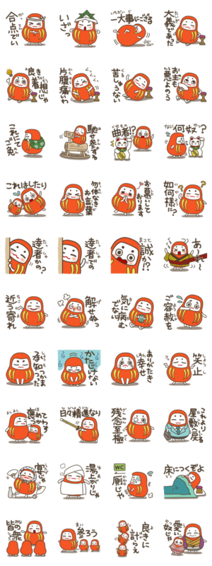 武士語で話す、だるまスタンプ。硬そうな言葉を、だるまさんがゆるゆるに仕上げてくれました。お風呂入ったり馬に乗ったり剣道したり飲み会に招き猫、でも全部だるまです。けこりーの。 より発売