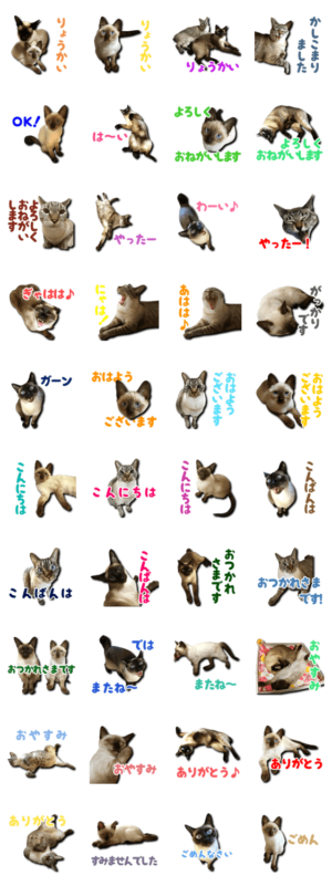 シャム猫えきさいてぃんぐきゃっつ!のメンバー5猫全員の“了解”など挨拶等々のスタンプです。NYARI より発売