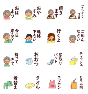 高齢者の方でも使いやすい家族間スタンプ第2弾【入院介護編】です。背景は白く、文字は大きいデザインにしています。初めての方でもスタンプのみで会話が出来ますよ。