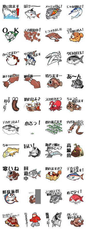 海で釣れる魚は、堤防からでも船からでもいっぱいいます!そんな海の仲間達とLINEでもいっしょに楽しめるスタンプです。釣り具の天狗堂 より発売