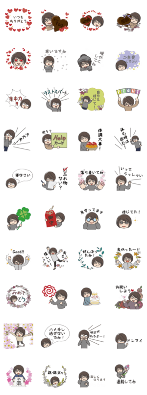 眼鏡女子の愛と応援メッセージ スタンプ画像一覧