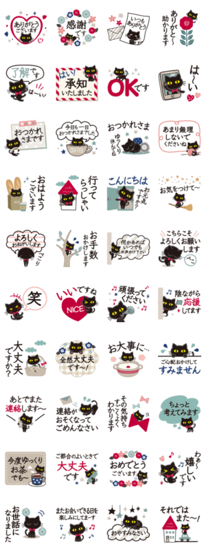 くろねこの敬語スタンプです。お友達にはもちろん目上の方にも送りやすいスタンプです。