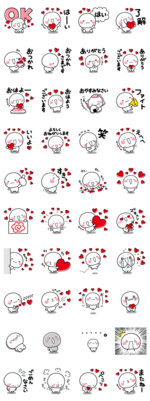 内容を厳選した使用頻度が高い基本言葉に、好きの気持ちが伝わるよう文字とハートをたくさん追加したしろまるのスタンプです。【作:いしいともこ】