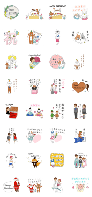 大人かわいい、お祝い年間行事スタンプです。動物たちも素敵です!