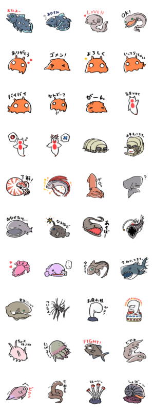 メンダコやシーラカンスなどの深海生物のかわいいスタンプです。クリオネやオオグチボヤは少しだけ背景が透けます。雪ひいろ より発売