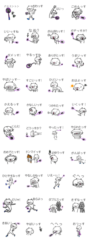 バドミントンをしているネコのスタンプです!バドミントンクラブの仲間の間で使ってあげてください!英語版、インドネシア語版も別途出しています。