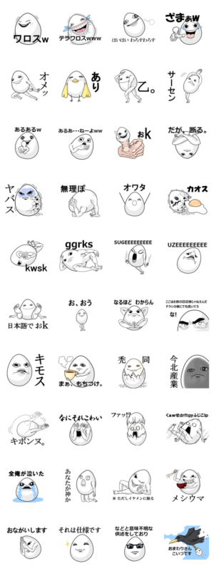 さぁ、ハイパーたまごタイムの始まりだ。様々な表情、ポーズでネットスラングを吐き出すこの卵の職業は、刺身の上にタンポポを乗せる仕事。のりきん より発売