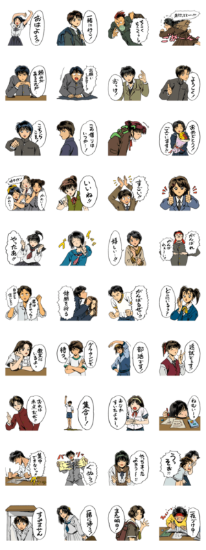 人々のスタンプ学生編です。友人などとのやりとりに使えそうなもの、使いにくそうなものも含め、おおまかに集めたセットです。河村ミリ より発売