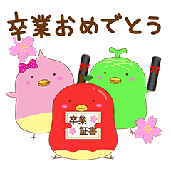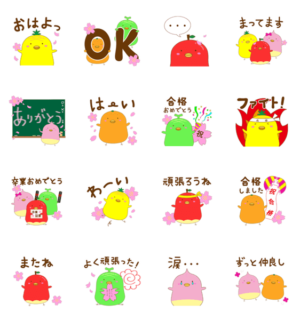 フルーツの形をしたひよこ達「ふるぴよ。」の、卒業式や受験シーズンにおすすめのスタンプ。