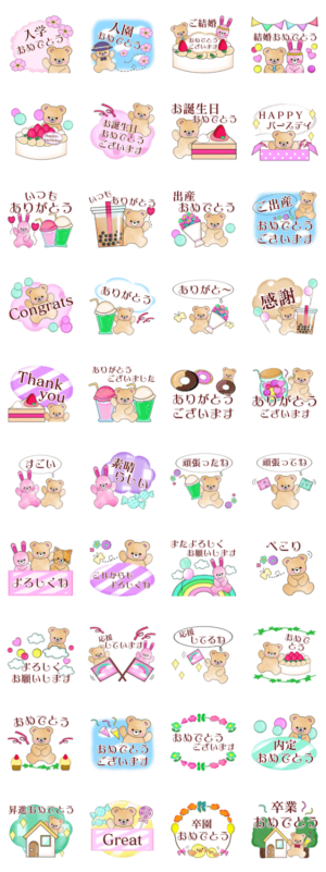 敬語丁寧語/くま/うさぎ/スイーツ/かわいいお祝いスタンプ/誕生日/ご結婚/ご出産/入学/入園/卒業/ありがとう/お願いします/おしゃれ/挨拶/ありがとうございます/おめでとう