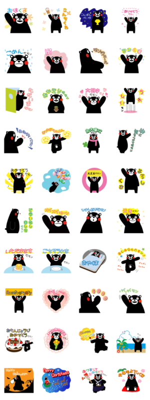 よく使うあいさつやクリスマス・お正月などのイベントのスタンプもあるよ。くまモンのスタンプでトークを楽しもう!くまもと大好きだモン!©2010熊本県くまモン#K15732mtorak より発売
