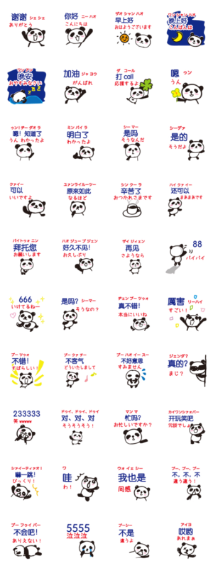 日本語、中国語のバイリンガルなパンダスタンプ。便利な読める中国語。世界中のお友達との会話に活用してください。外国語LINEスタンプ他多数有