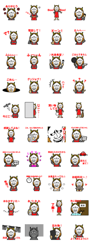 素顔を隠し、夜叉のお面を被った鬼嫁が叫ぶ!無表情のはずなのに、なぜか表情があるようにも見えてくる?日常会話で使いやすいスタンプを用意しました。kemipyon より発売