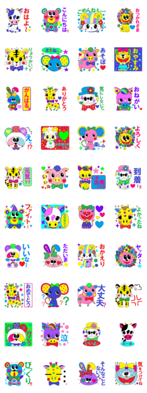 カラフルでかわいい動物たちが大集合♡とっても使える日常会話★初登場のキリンやトラ、ブタちゃんやネズミなど楽しくて愉快なスタンプです♪