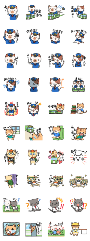 ネコが車掌さん・鉄道ファン・お客さんになりました。日常でも普通に使えるスタンプです。なか より発売