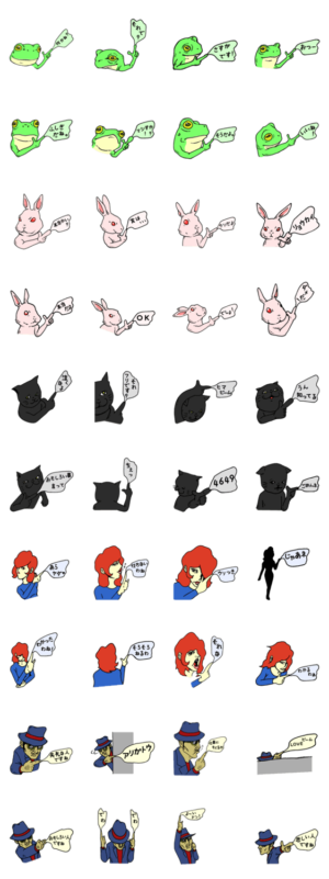 あなたの気持ちを伝える4名のメッセージスナイパーです!No.1 かえる No.2うさぎ No.3くろねこ No.4ウーマン No.5マン お好きなスナイパーをご利用ください!