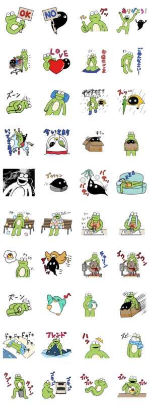 SNSにて4コマ漫画を更新中の、かえるのカルパス。その登場人物のスタンプの第四弾!カエルとオバケのコンビだよ!