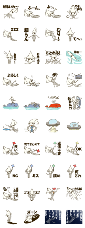 やる気ない、怒りっぽい、自己中心的なイカです。※当スタンプはあなたの交友関係に悪影響を及ぼす可能性がございます。ご利用の際はご注意ください。