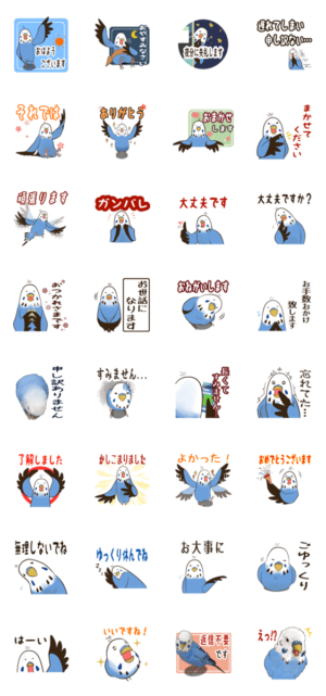 敬語よりの青いセキセイインコのスタンプです。お仕事や日常会話で使えそうな言葉を集めました。ゆるかったりリアルだったりします