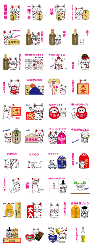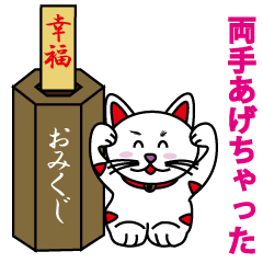 招き猫による超ポジティブスタンプ。大吉とか必勝とか前向き。クリスマス、正月、バレンタイン、入学、入社、などにぴったり。おみくじやお守りもついてます。イシイデザイン より発売
