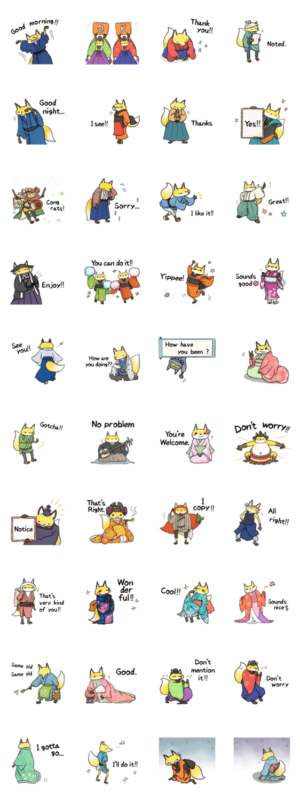 江戸なキツネのスタンプ、英語版。きつねと時代劇好きな人にいっぱい送信していきましょう。