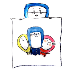 シュールでかわいい忍者スタンプ第二弾。一番年上、兄の青忍者。真ん中の弟、黄忍者。末っ子の妹、赤忍者。 三人、只今修行中。立派な忍者になるために....