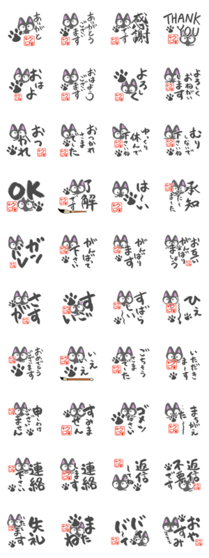 『ちびクロ』スタンプから【書道編】の第二弾です。文字を筆で描いた、習字風のスタンプです。インパクトがありつつ可愛くお返事します。『ちびクロ』の絵文字もあります。かたこ より発売