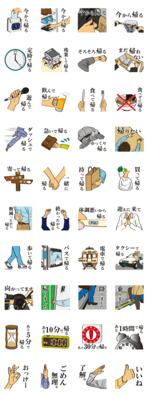 帰る連絡をする時用のスタンプ。毎日の帰宅連絡に文字を打たなくても「今から帰る」やサラリーマンの「定時で帰る」など男性・女性・学生みんなの『帰ります』に使えます。