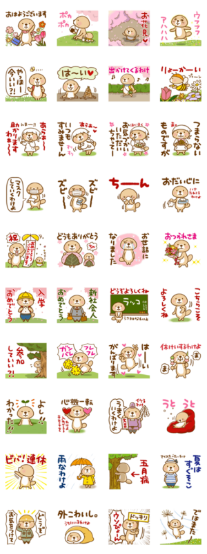 あなたに代わってストレートに気持ちを伝えるラッコさんの春。お花見、花粉症、入学、新社会人など新生活に使えるあいさつなどもいっぱい入ってます