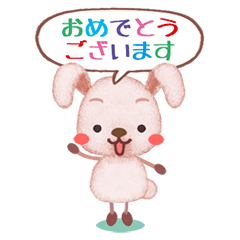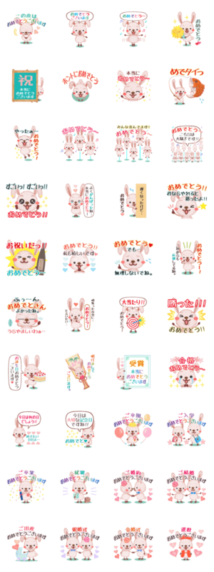 可愛いウサギのスタンプです。日々の様々な「おめでとう」のシーンから、誕生日や結婚式、ご出産、そしてご入学や還暦まで…人生の「おめでとう」のイベントにも使えます。aki より発売