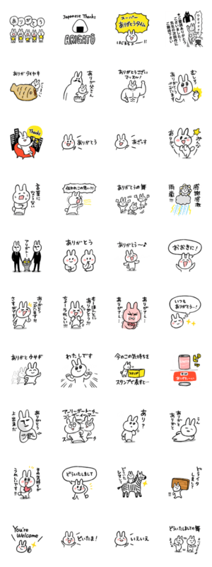 感謝の気持ちを表すスタンプ第二弾です。ありがとうございマッスル、ご愛読ありがとうございました等々、白いうさぎさんが適当に代弁します。どういたしましてもあるよ!ヒカリビタミン より発売