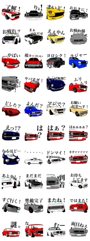 懐かしい日本の旧車シリーズ!吹き出しで会話バージョンパート3!今回もデカ文字!旧車乗りの方はもちろんクラシックカーが好きな方も気軽にお使い頂けるスタンプです!mocchi より発売