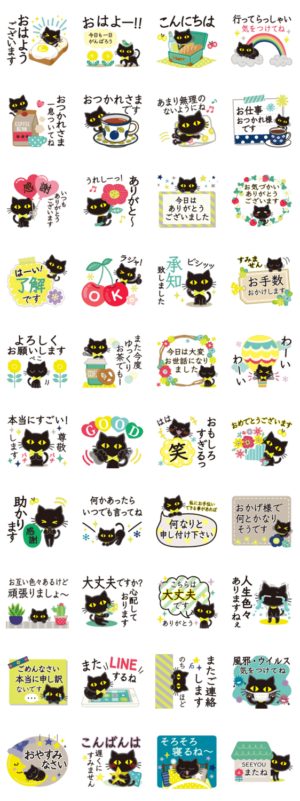 シンプルで大人が使いやすい黒猫スタンプ☆明るい北欧テイストで春〜夏にぴったり♪長文で気持ちが伝わりやすく敬語とカジュアル語があるので年上から友達幅広く使えます☆紅おれんじ より発売