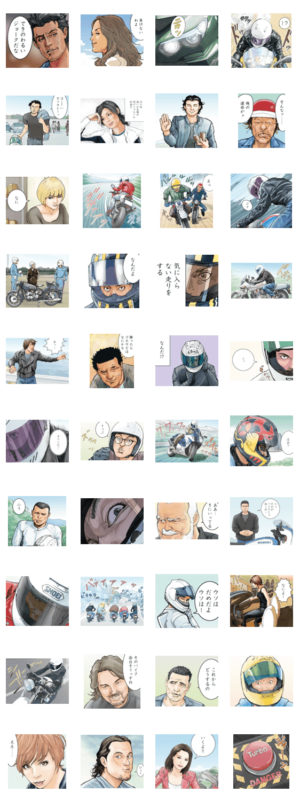『キリン』の東本昌平氏がプロデュースするバイク雑誌『東本昌平RIDE』の公式スタンプ。使うシチュエーションは選びます。が、それはそれ。存分に浸って下さい。