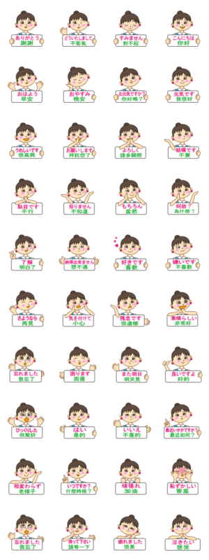 ミミさんです。このスタンプは、日本語と台湾華語(中国語の繁体字)の日常会話です。みなさんは、台湾・中国の友人と良い交流することができます。