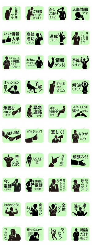 LINEのスタンプは可愛いすぎてちょっと……。そんな大人でいけてるビジネスパーソンへ。シンプルなシルエットを用いた、実際の業務でも使えるビジネススタンプです。