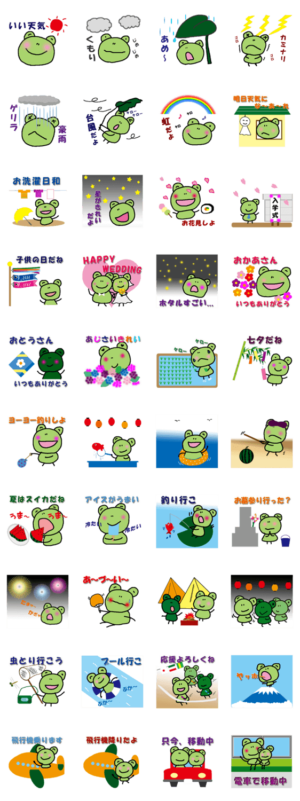 カエルのけろ吉の楽しい楽しい春夏の行事です。桜、田植え、七夕、お盆、運動会、花火、縁日…けろ吉と一緒に楽しんでください。けろ吉スタンプ第2弾RINORINO より発売