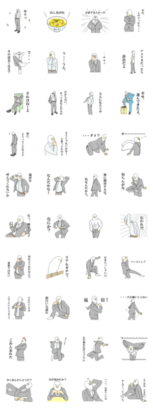 スーツの鳥がシュールでウザい、若干中二病の面白スタンプです。サホ より発売