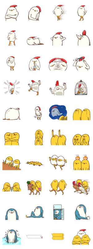 何があろうとも空を飛ばず陸地で生活すると決めた鶏とひよこ達のスタンプ。