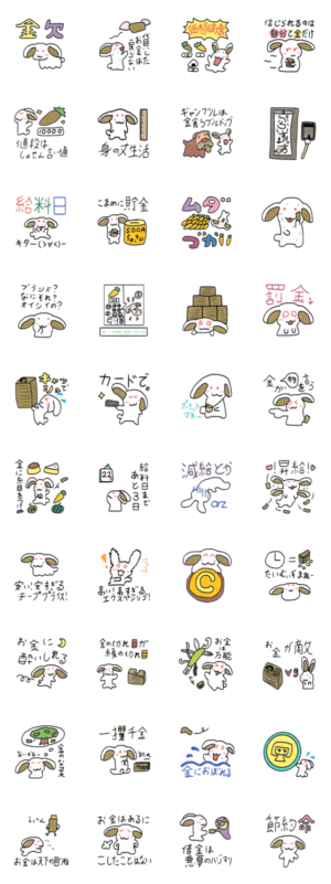 「お金は万能」「借金は悪夢のハジマリ」などのオリジナルの名言を、金欠うさぎがお届けします。また「一攫千金」「金の切れ目が縁の切れ目」などお馴染みのスタンプも。