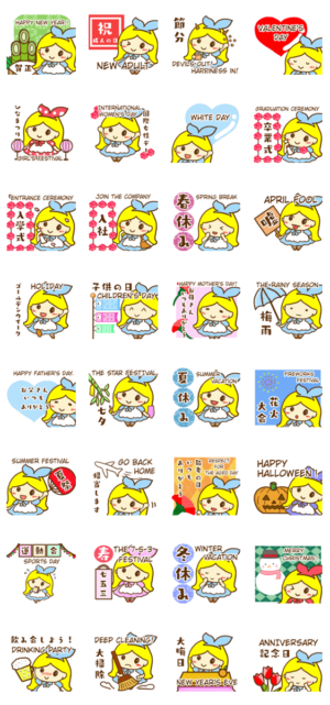 年間通して使える、不思議な国のアリスの季節行事やお祭りのスタンプです。