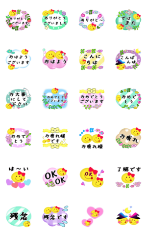 にこちゃんスマイル/動くスタンプ/大人女子ほんわか日常会話毎日使えるおしゃれなお花畑敬語/お疲れ様です/了解/ありがとうございます/残念/お大事に/おめでとうございますmamama-chin より発売