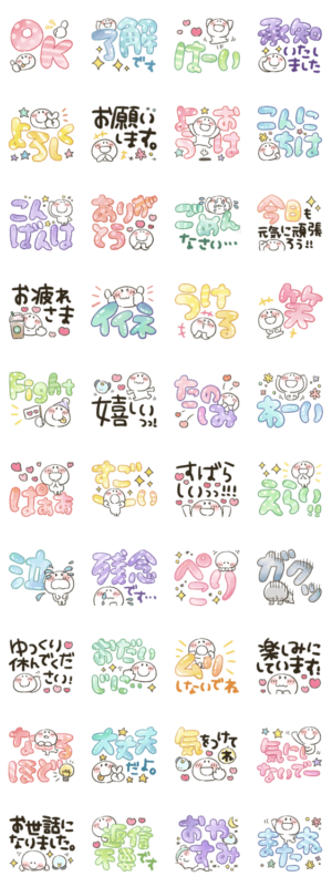 まるぴのスタンプ66作目は、でか文字スタンプです。大きめ文字で見やすい!カラフル、パステルカラー、グラデーション、ドット、ボーダーかなぴ より発売